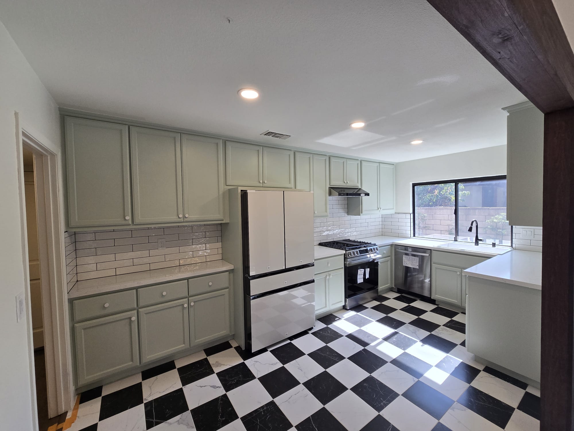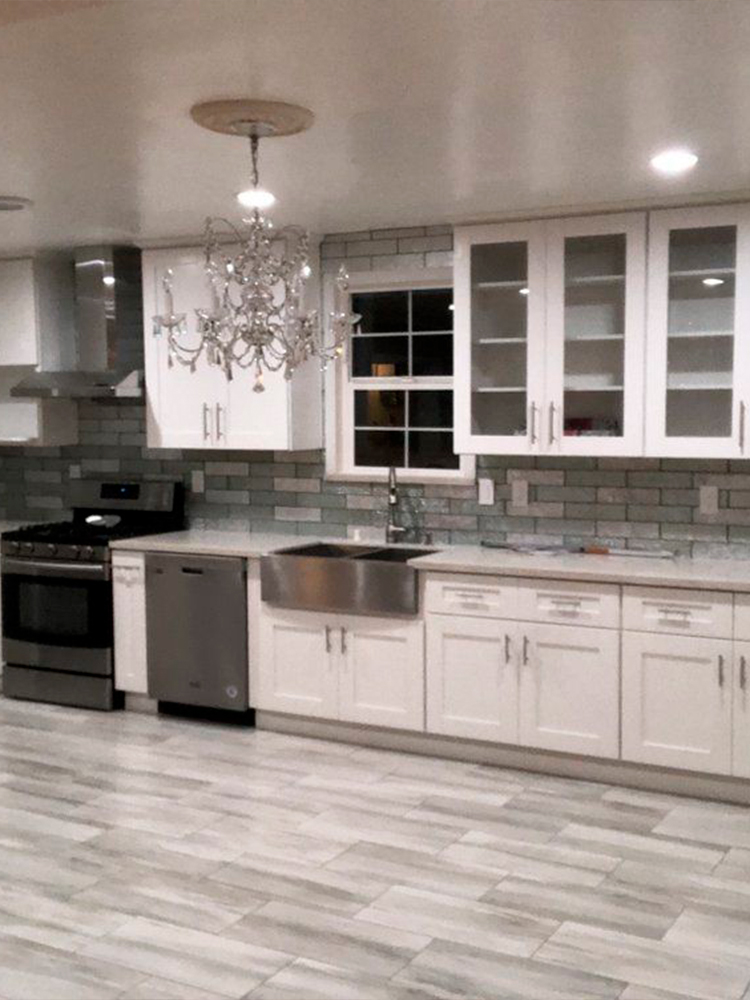 A modern kitchen featuring sleek white cabinets, stainless steel appliances, and a beautiful gray subway tile backsplash. The polished tile floor and contemporary lighting create a clean and sophisticated look.